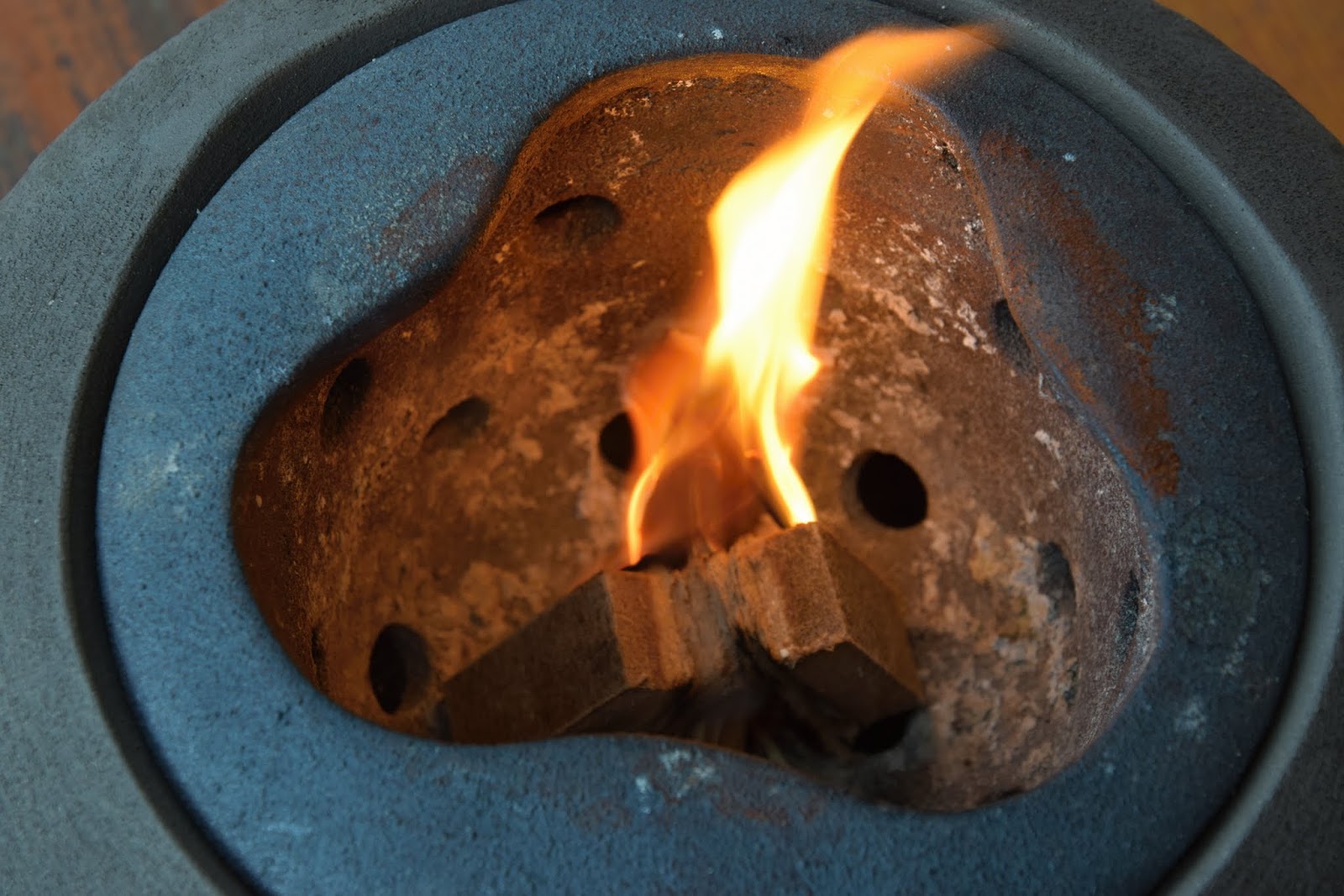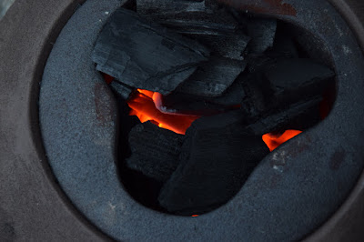 Last thing I would like to share today is my shift in the whole "how to light up" question. Last year I started experimenting with charcoal lighters. Our kitchen electric glass stove does not like do this dirty work so much...And later I actually found out that, when you use the right charcoal lighter in the right way, it works even better. Of course, we are not going to use any heavy-chemical lighters for our tea fire. But still, when using charcoal lighter, do it outside - charcoal, before it is on fire, smokes. Sometimes a lot (remember: cleaner lighter and drier charcoal means less smoke!)